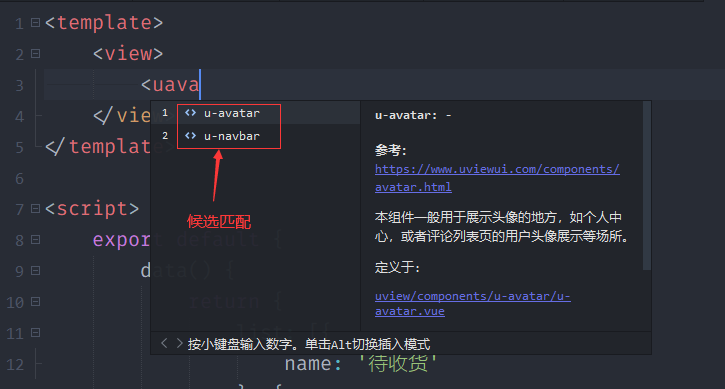 在"*.vue"文件的模板编写区域,通过<u开头的关键字,就能 触发uView的组件候选列表: