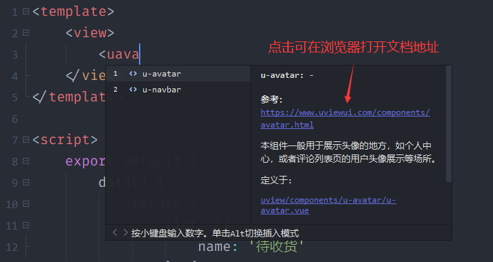 <u关键字(无需<up-后面的-),HX会通过弹出提示列出uView的所有组件 - 可以在提示中一键直达对应组件的官方文档