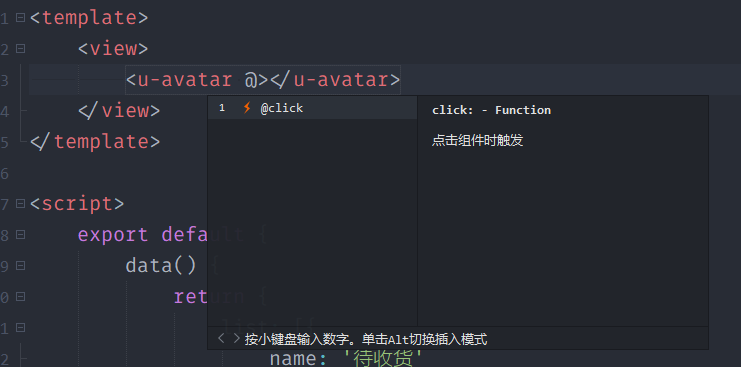 某些组件有回调事件,通过@开头,即可列出对应的事件名称,右边有事件对应的说明,回车即可自动键入。